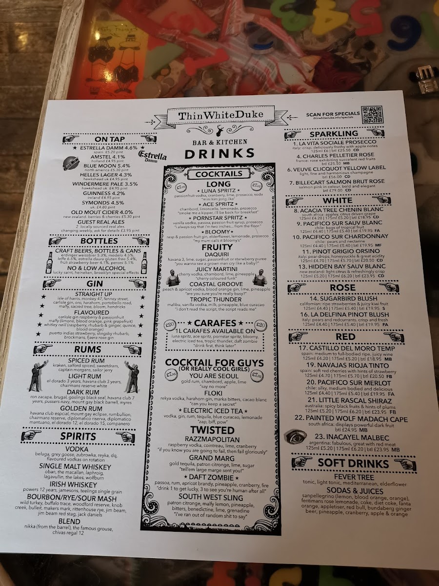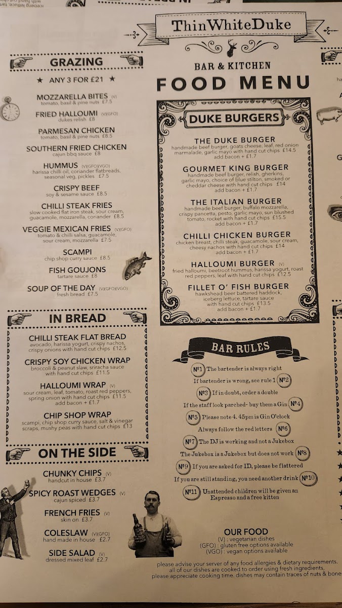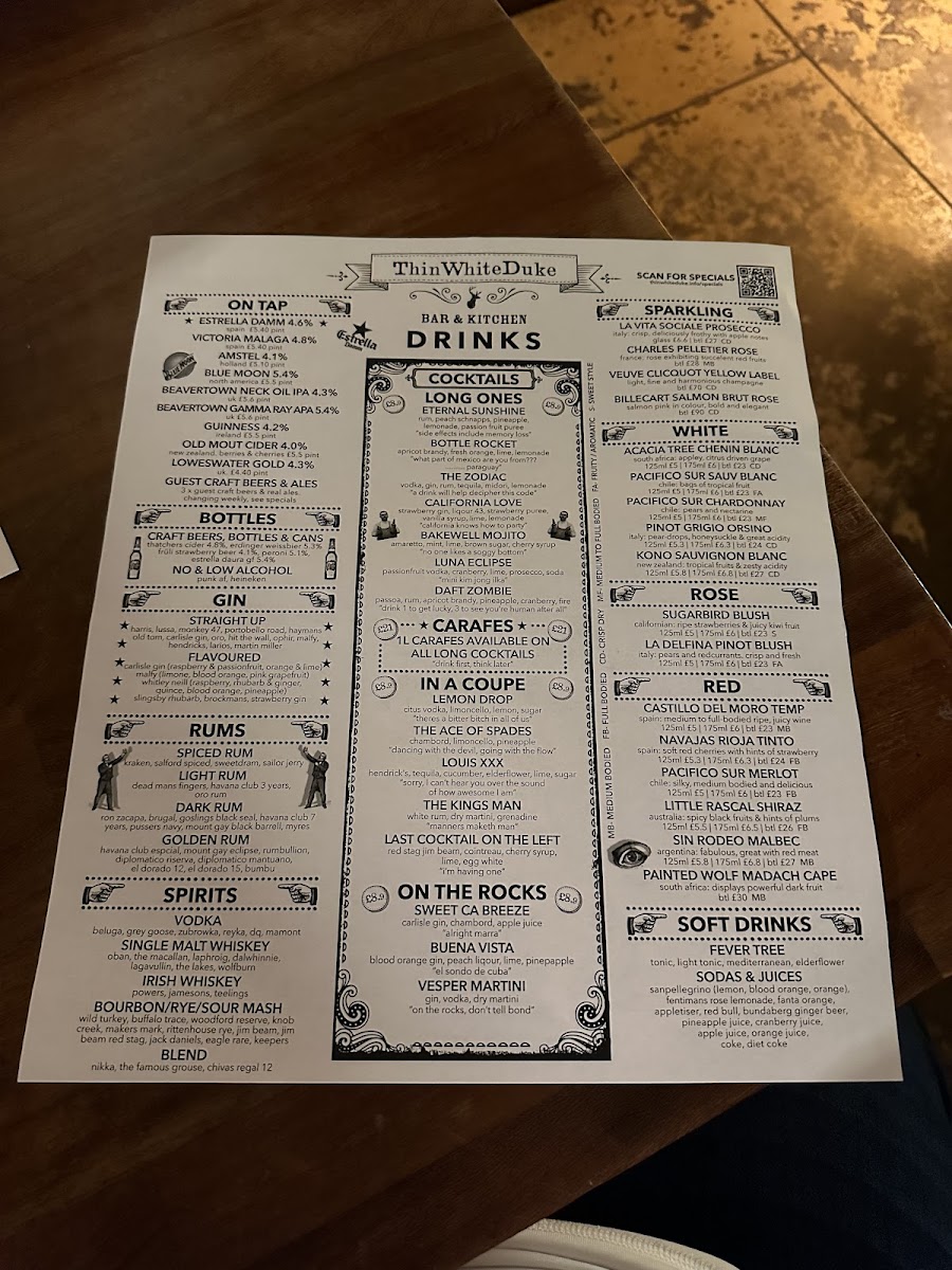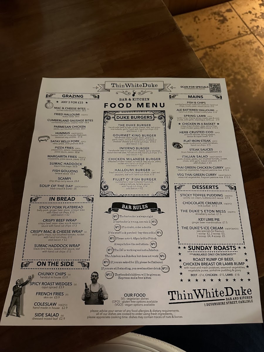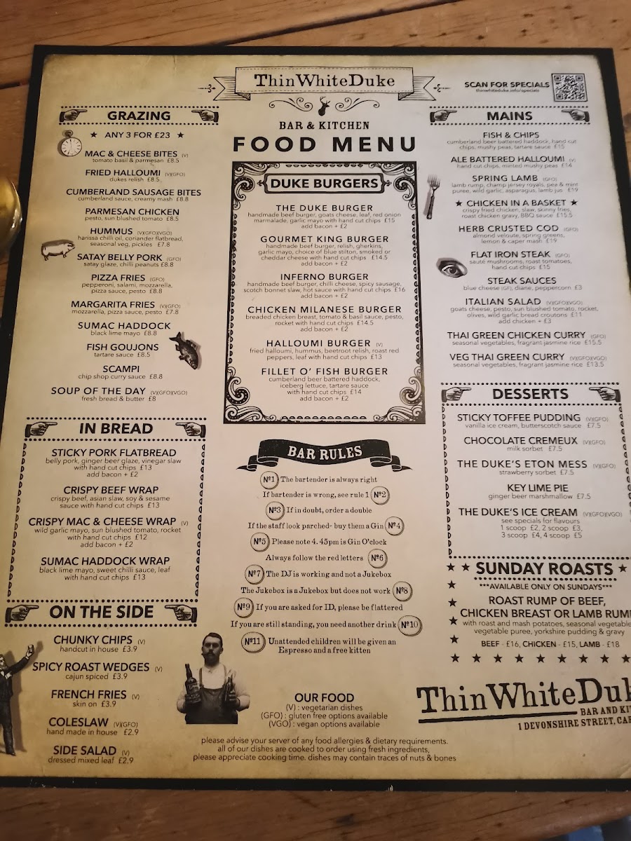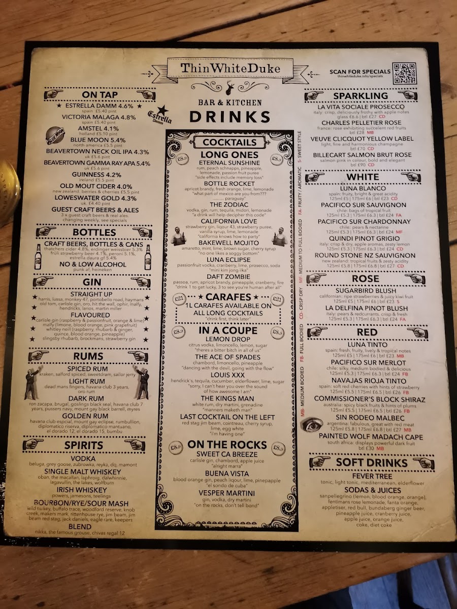 In conclusion, Thin White Duke’s menu offers a diverse range of dishes that cater to various tastes and preferences. From its hearty mains to creative appetizers, it’s clear that this establishment values both quality and innovation. Whether you're a local or a visitor, a meal here is a must for anyone seeking an exceptional dining experience in Carlisle.